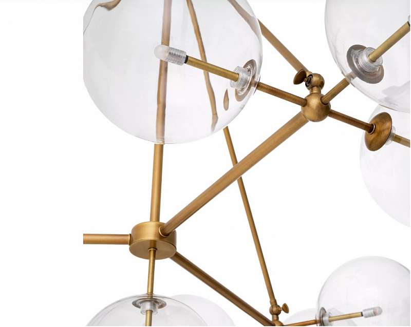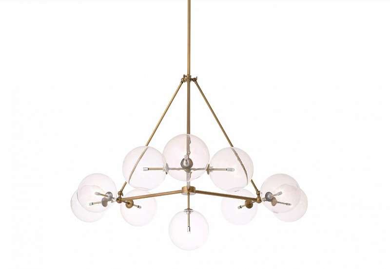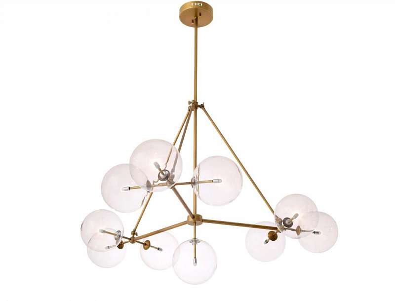 Люстра на 10 лампочек. Плафоны выполнены из прозрачного стекла. Основание из состаренной латуни.