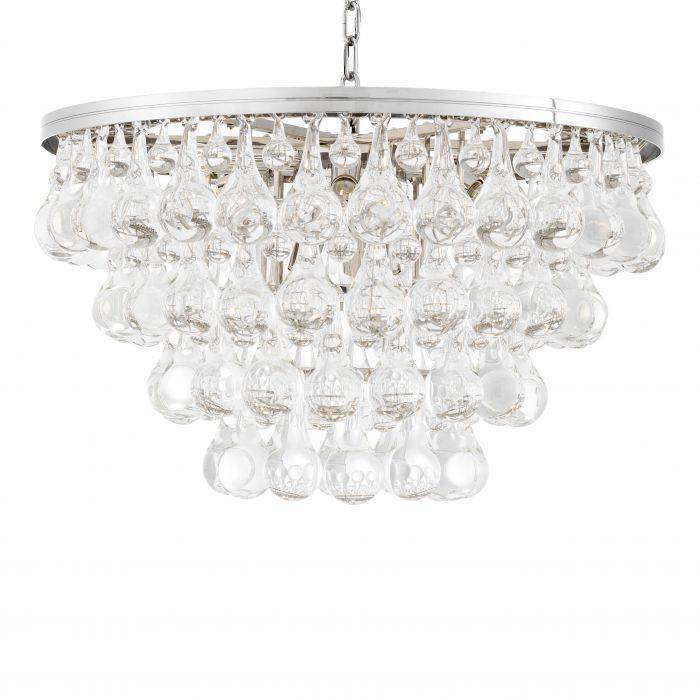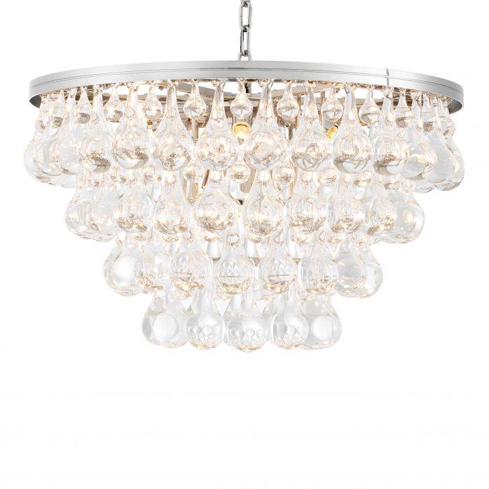 Классическая люстра представляет собой множество стеклянных подвесок, собранных на металлическом кольце в никелированной отделке.