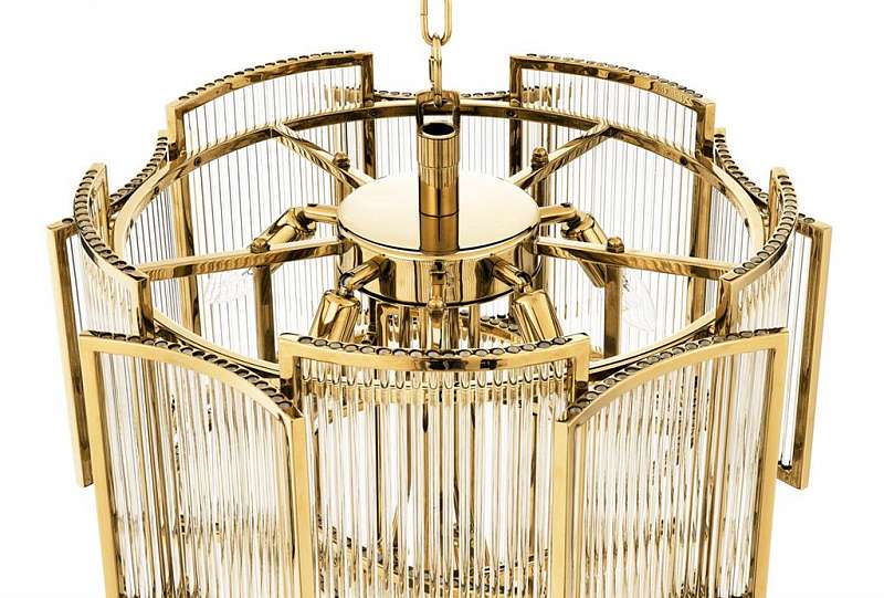 Люстра подвесная выполнена из прозрачного армированного стекла в металлических рамках с золотой отделкой.