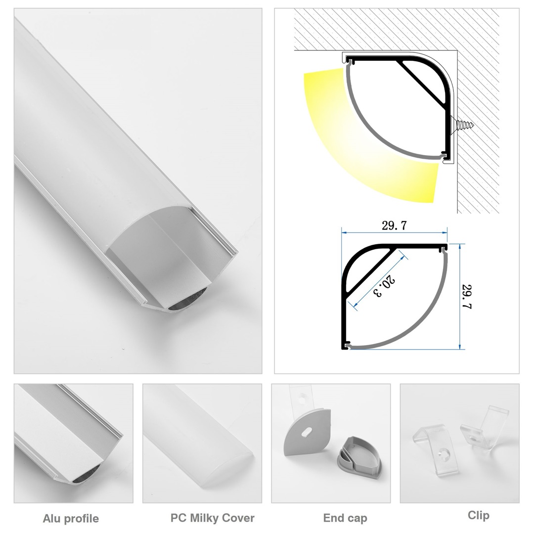 Алюминиевый профиль для LED ленты предназначен для встраиваемого монтажа и поставляется в комплекте с рассеивателем "опал". Посадочное место под ленту до 10мм.