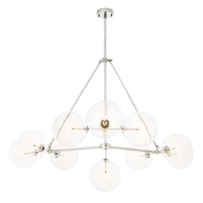 Изящный современный светильник с никелевым покрытием содержит 10 прозрачных стеклянных шаров, на каждом из которых установлена собственная лампочка.