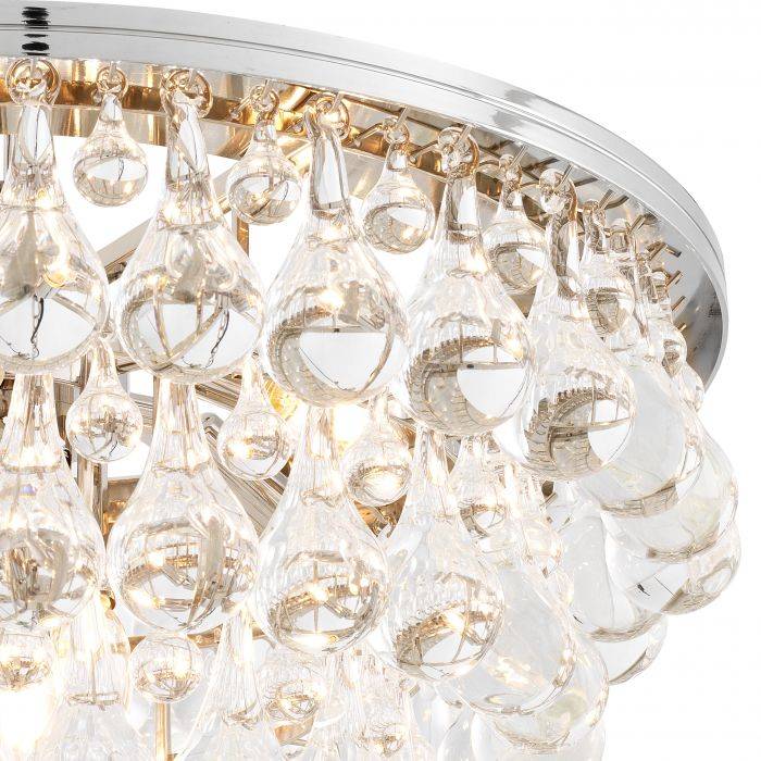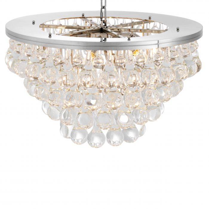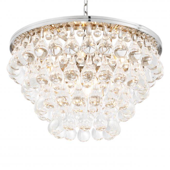 Классическая люстра представляет собой множество стеклянных подвесок, собранных на металлическом кольце в никелированной отделке.