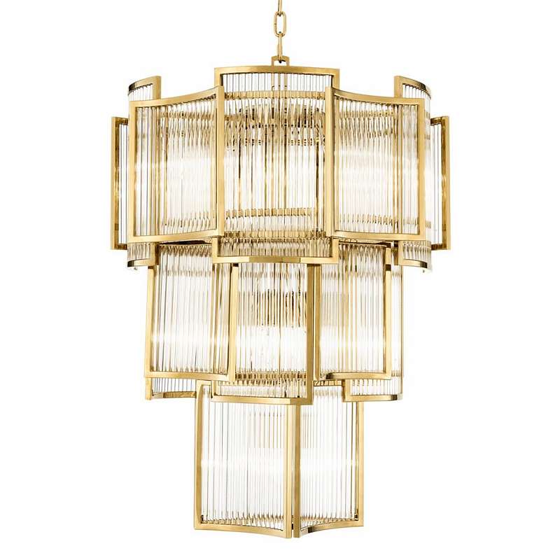 Люстра подвесная выполнена из прозрачного армированного стекла в металлических рамках с золотой отделкой.